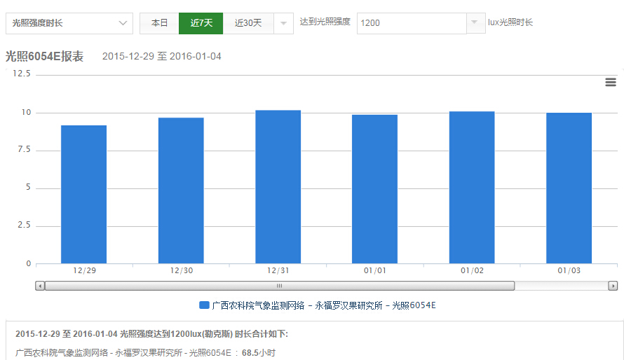 利用空氣溫度傳感器、空氣濕度傳感器、光照度、降雨量等傳感設(shè)備實時監(jiān)測羅漢果種植的氣象環(huán)境。實時監(jiān)測的環(huán)境情況數(shù)據(jù)每隔10秒鐘就上傳到“天潤智力智慧農(nóng)業(yè)云平臺”,羅漢果研究人員只要登錄手機APP或者在電腦上,就可以遠程隨時隨地查看羅漢果種植園區(qū)的各項關(guān)鍵數(shù)據(jù)。所采集的數(shù)據(jù)實時上傳到天潤智力智慧農(nóng)業(yè)云平臺,并快速進行統(tǒng)計分析,解決了科研人員對數(shù)據(jù)的采集分析需求,并確保了數(shù)據(jù)采集的精準、快速。且在云平臺報表中心,研究人員可以隨時調(diào)取任何時間的數(shù)據(jù)進行對比分析,更全面直觀地了解到氣象數(shù)據(jù)的變化與羅漢果生長情況的關(guān)系。