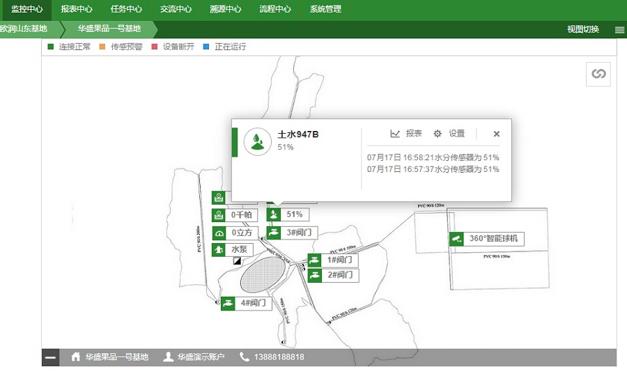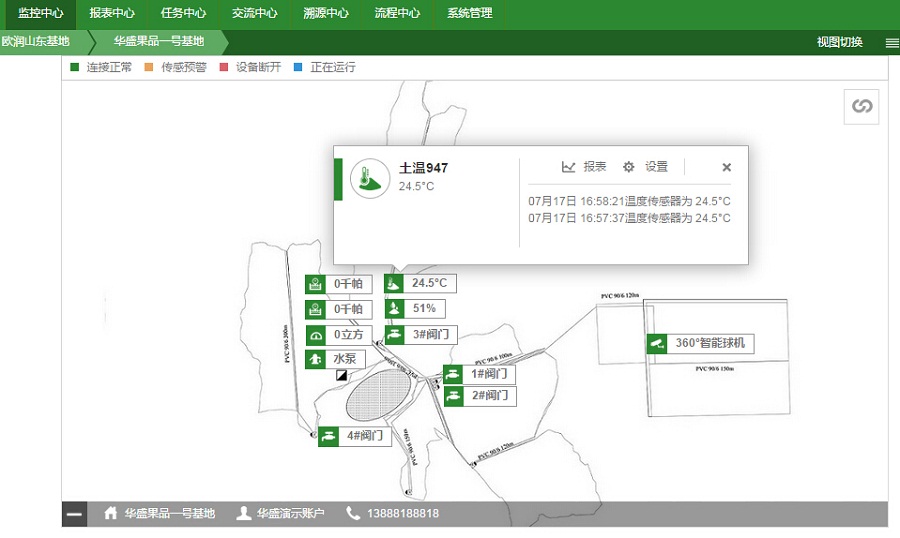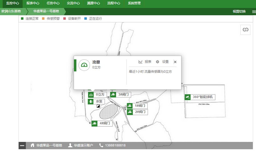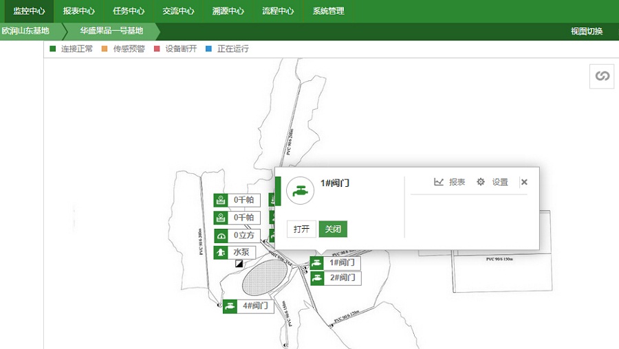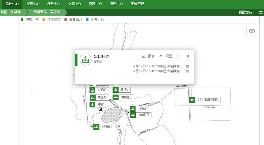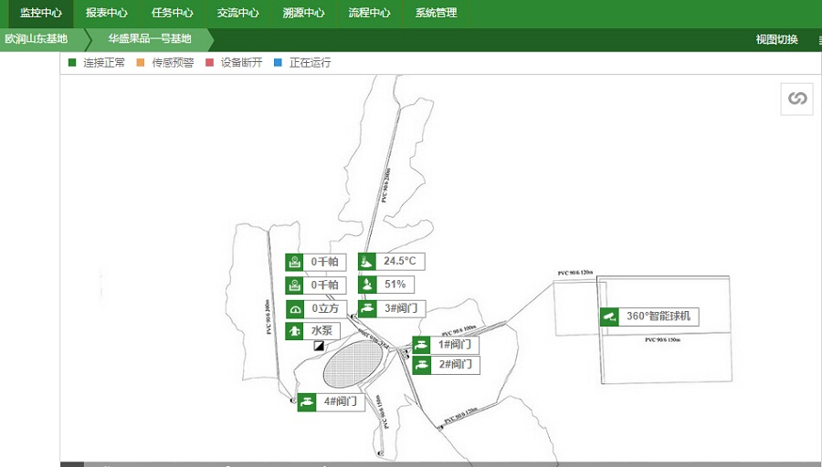 2015年華盛果品引入東山歐潤水肥灌溉一體化系統(tǒng),在園區(qū)全面部署了滴灌系統(tǒng),將園區(qū)規(guī)劃為5個獨(dú)立灌溉區(qū)域,可進(jìn)行獨(dú)立灌溉作業(yè)。并借助天潤智力智慧農(nóng)業(yè)云平臺技術(shù),實(shí)現(xiàn)全自動化遠(yuǎn)程灌溉,徹底結(jié)束傳統(tǒng)人工灌溉模式。為了能夠智能化地進(jìn)行灌溉作業(yè),天潤智力智慧農(nóng)業(yè)云平臺通過傳感器監(jiān)測土壤溫濕度、360°高清視頻監(jiān)測園區(qū)灌溉情況,以及實(shí)時監(jiān)測泵房的水壓流量,讓管理員可以多維度、多角度,綜合多種數(shù)據(jù)對灌溉作業(yè)進(jìn)行全面分析與掌握。