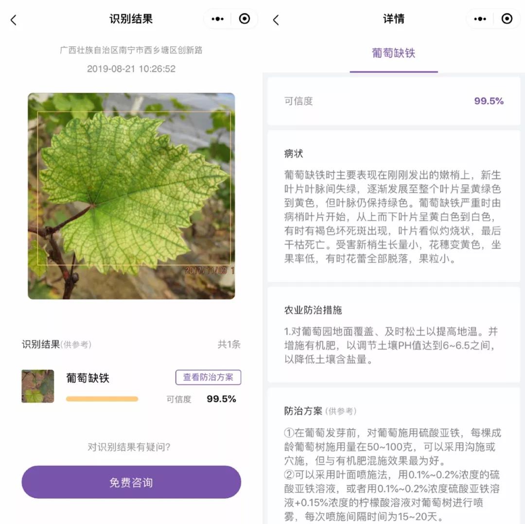 此外,葡萄園員工利用天潤智力人工智能應用——耘眼(微信小程序/APP),只需要用手機拍攝葡萄的葉片、果實照片,就能進行病蟲害識別,從而獲得對應的防治措施和用藥方案。目前,耘眼基于上萬張樣本量,能夠識別幾十種陽光玫瑰葡萄常見病蟲害,識別準確率達98%以上。