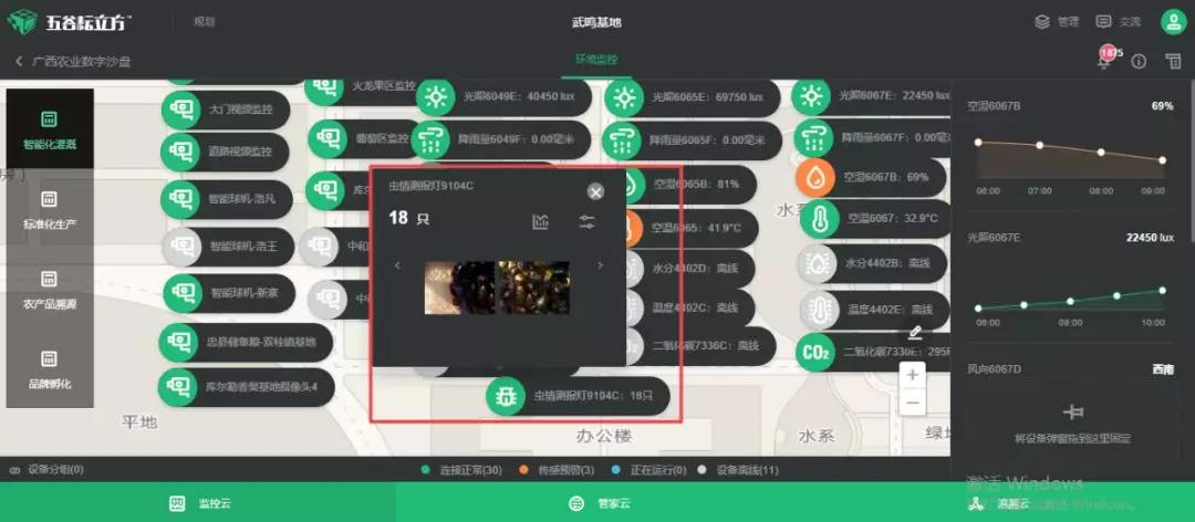 天潤智力在試驗站內(nèi)安裝了智能蟲情測報燈,在害蟲出沒高峰期進行誘蟲捕獲并拍照。通過系統(tǒng)遠程查看接蟲盒內(nèi)的蟲子情況,實現(xiàn)區(qū)域的病蟲害監(jiān)測和害蟲類別的自動分類和計數(shù),當系統(tǒng)監(jiān)測到接蟲盒內(nèi)的蟲子數(shù)量超過預設的數(shù)量時,系統(tǒng)會自動預警,提醒用戶此時為蟲害高發(fā)期,應及時防治。