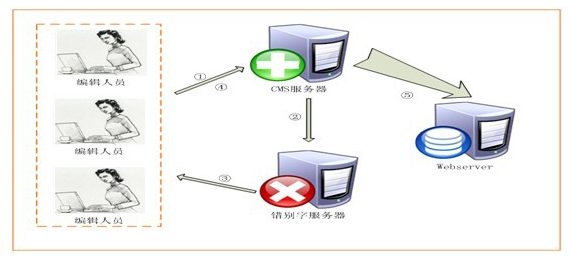 與CMS(內(nèi)容發(fā)布系統(tǒng))聯(lián)動掃描模式網(wǎng)站錯別字監(jiān)測平臺提供與CMS發(fā)布系統(tǒng)結(jié)合的WebService接口,國內(nèi)常見的CMS系統(tǒng)均可與G-ONE錯別字系統(tǒng)實現(xiàn)良好的對接。網(wǎng)站編輯人員可在信息編輯完成后,先提交給錯別字服務(wù)器審核,如檢測到錯誤,則返回修改;如無錯誤,則發(fā)布至web服務(wù)器。