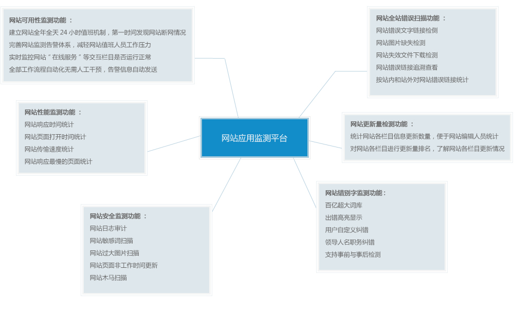 | 功能特點 網(wǎng)站無法訪問、頁面突變、被掛木馬等異常第一時間自動告警。 網(wǎng)站錯別字、敏感詞檢測,提升網(wǎng)站文字安全。-網(wǎng)站內(nèi)容維護 網(wǎng)站錯誤圖片、錯誤鏈接檢測,提升網(wǎng)站質(zhì)量,增加網(wǎng)民滿意度。 網(wǎng)站過大圖片、過慢頁面檢測,為網(wǎng)站性能優(yōu)化提供依據(jù)。 提高信息更新量,將網(wǎng)站群現(xiàn)有日更新量提高20%以上。 提升瀏覽點擊率,為各部門網(wǎng)站結(jié)構(gòu)設(shè)置提供依據(jù)。 |