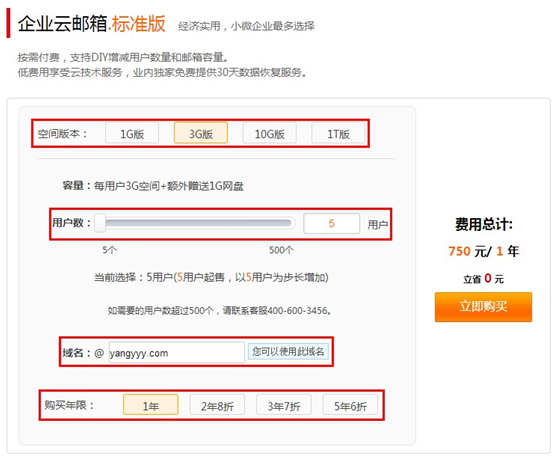 2. 選擇所需用戶數(shù)。如果5個(gè)人用郵箱就選擇5個(gè),可拖動(dòng)滑動(dòng)條或直接在文本框中輸入數(shù)字;