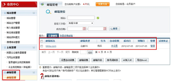 付費(fèi)完成后用戶可以在會(huì)員中心中的郵箱管理里查看到此郵箱產(chǎn)品。