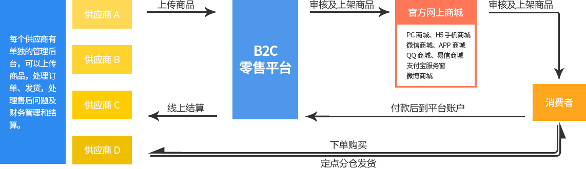 多供應(yīng)商零售電商解決方案,主要是幫助企業(yè)打通上游供應(yīng)鏈,整合已有的資源優(yōu)勢,結(jié)合線上全渠道銷售通道,構(gòu)建一個智能化的零售商業(yè)生態(tài)圈。0倉儲成本,定點發(fā)貨,是企業(yè)零售運營的新模式。