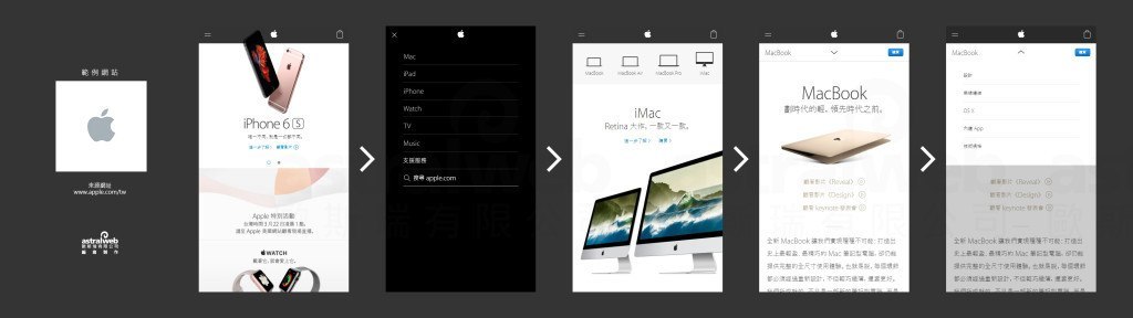 Apple選單使用跳頁方式呈現(xiàn),在選擇產(chǎn)品大分類后,進(jìn)入該類別的專頁,不使用相同的選單樣式,而選擇使用橫式滑塊,并使用分類圖做搭配,在第三層產(chǎn)品介紹項(xiàng)目頁面中,使用第二階層下拉選單。他將每一層做區(qū)分,并針對(duì)每一層的不同需求,而對(duì)應(yīng)不同的選擇方式。
