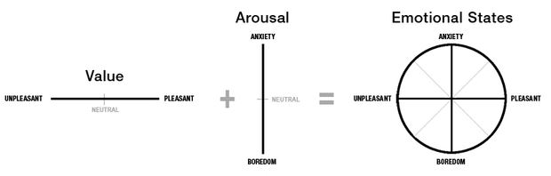 喚醒度是指身體、大腦或特定行為的無意識激活。人們使用焦慮(anxiety)對無聊(boredom)的水平來定義它;我們可以通過心跳速率、呼 吸、血壓和皮膚電來測量它。簡言之,你可以將喚醒度看作是刺激或激活的水平。我們將情緒的兩個維度(也就是,意識/認知和無意識/生理)結合,就得到情緒 的環(huán)狀模型。