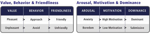 情緒的價值維度能夠影響我們的行為(即,趨近還是回避),而喚醒維度則影響我們做事情的動機。情緒影響行為的不同方面,而隨著時間的推移人們會將情緒的表達知覺為不同的人格方面。價值影響友好性的知覺,喚醒則影響支配性的知覺。
