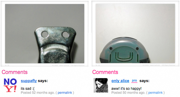 觀察下面的兩個簡單物體。它們在表達情緒嗎?作為靜態(tài)的物體,它們表達的任何情緒都不會隨著時間的推移而改變。如果人格的主要維度是友好性和支配 性,你覺得哪個物體更友好?哪個更具有支配性?看看人們在照片下面留下的評論。快樂與友好的神態(tài)、愉悅和趨近行為相關,而悲傷則與不友好、痛苦和回避行為 相關。