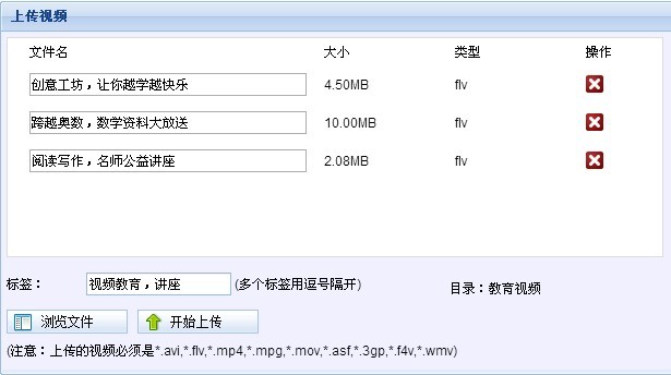 (1)在管理視頻界面中點(diǎn)擊“上傳視頻”,從彈出的對(duì)話框中點(diǎn)擊“瀏覽文件”,選擇本地的一個(gè)或多個(gè)視頻文件并點(diǎn)擊確定,選擇視頻分類(lèi),并為視頻填寫(xiě)標(biāo)簽,如下圖;