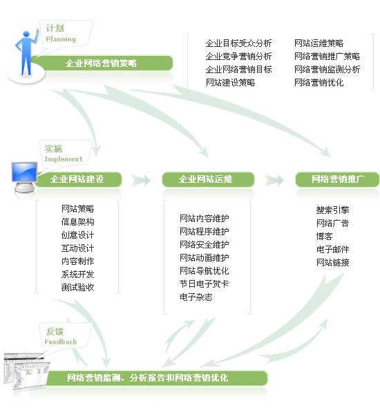 北京網(wǎng)站建設(shè)中心提供全面的企業(yè)網(wǎng)絡(luò)營銷解決方案,解決方案的實(shí)施包括三個階段:計(jì)劃階段、實(shí)施階段、反饋階段。在計(jì)劃階段,我們首先確定客戶企業(yè)網(wǎng)絡(luò)營銷目標(biāo),通過對客戶目標(biāo)受眾和競爭對手營銷調(diào)研分析,制定出適合客戶的網(wǎng)絡(luò)營銷實(shí)施策略。網(wǎng)絡(luò)營銷實(shí)施策略不僅僅包括網(wǎng)站建設(shè)策略,還包括網(wǎng)站的運(yùn)維策略、網(wǎng)絡(luò)營銷推廣策略、網(wǎng)絡(luò)營銷監(jiān)測分析、網(wǎng)絡(luò)營銷優(yōu)化等。在實(shí)施階段,我們會根據(jù)制定好的網(wǎng)路營銷實(shí)施策略進(jìn)行網(wǎng)站建設(shè)、網(wǎng)站運(yùn)維以及網(wǎng)絡(luò)營銷推廣。反饋階段與實(shí)施階段是同時進(jìn)行的,在網(wǎng)站建設(shè)、網(wǎng)站運(yùn)維和網(wǎng)絡(luò)營銷推廣過程中,我們會根據(jù)網(wǎng)絡(luò)營銷監(jiān)測系統(tǒng)搜集的數(shù)據(jù)進(jìn)行詳細(xì)的分析,為客戶提供網(wǎng)絡(luò)營銷監(jiān)測分析報告,并提供可行性的網(wǎng)絡(luò)營銷策略優(yōu)化建議。